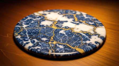 A collection of intricately designed blue and white coasters with gold accents on a matching blue surface