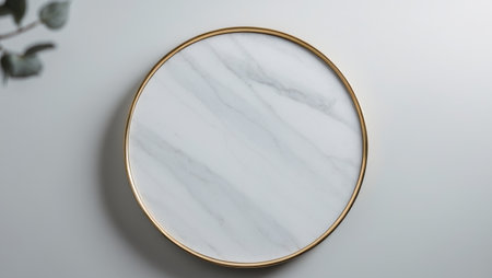 Round stylish fashionable frame mock up on white marble for text design. Concept of blogging, posting social networks.