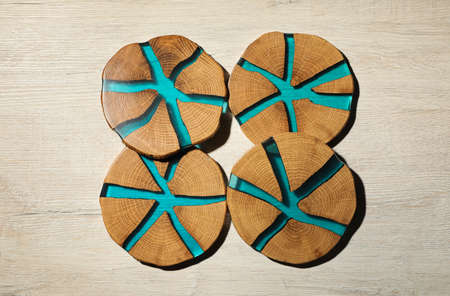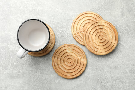 Stylish wooden cup coasters on light gray table, flat lay. Space for text