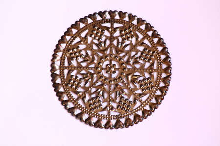 Fragment of an ancient carved wooden round plate on a white wall. Ornate background.
