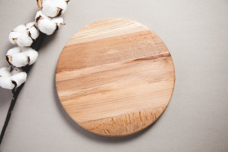 Background for brand presentation flat lay. A cork board on a cotton napkin on a white table. Environmental materials. Copy space for text, design or product