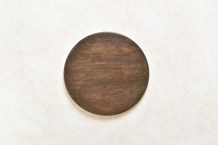 Wooden dark cutting board over light stone background with free text space. Top view, flat lay