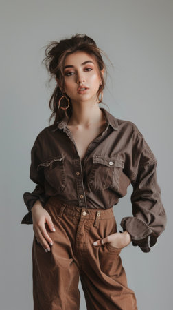Stylish Young Woman Modeling in a Trendy Brown Outfit and Gold Earrings