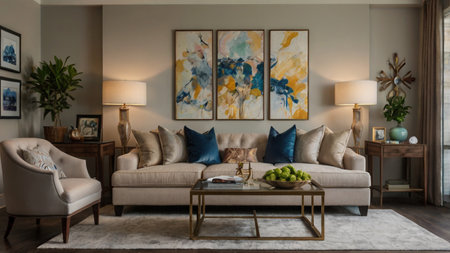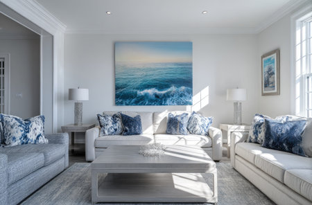 This living room showcases a bright, airy interior with neutral walls and matching furniture. Accent pillows and artwork introduce blue tones, creating a tranquil atmosphere. The scene, bathed in natural light, could be suitable for lifestyle and home decor projects, and is ideal for various commercial applications.