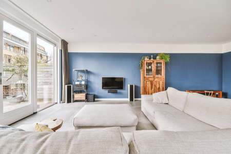 Living room interior design in a modern minimalist style with large windows, a gray sofa, a wooden wardrobe and a TV set on a blue wall