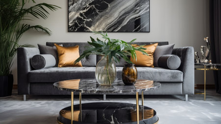 Luxury composition of home interior design with modern velvet sofa, marble coffee table, pillows, flowers elegant accessories and geometric paintings on the wall. Stylish home decor. Template.