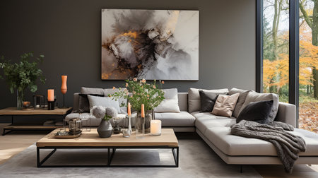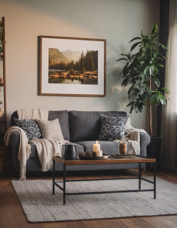 Cozy living room interior with gray sofa, coffee table, candles and posters