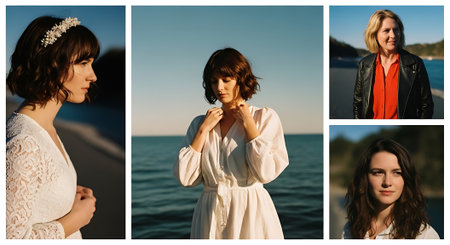 A triptych of a woman in various poses and attire, set against a serene landscape with a clear sky during sunset, showcasing different expressions and outfits.