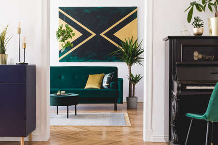 Stylish luxury home interior of sitting room with green velvet sofa, coffee table, shelf, piano, pouf, tropical plants, pillows and elegant accessories. Modern and cozy home decor. Template.