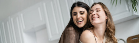 Cheerful lesbian women standing in kitchen at home, banner