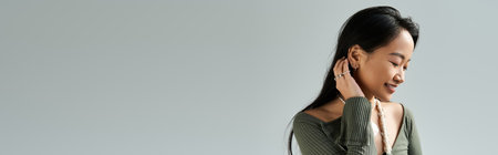 A young beautiful asian woman expresses joy while gently touching her hair with a warm smile.