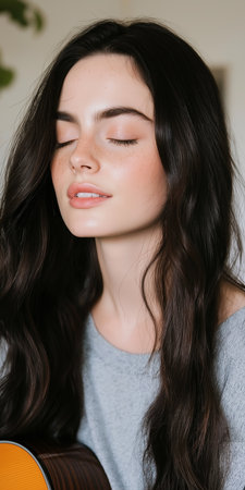 Serene Woman with Long Hair Relaxing Indoors with Closed Eyes and Guitar.