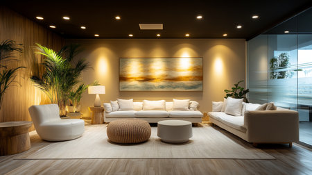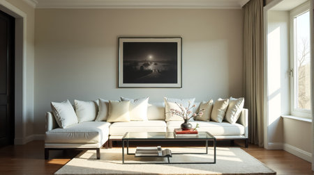 Modern minimalist living room design featuring neutral tones, decorative plants, and stylish furniture in a serene atmosphere. Generative AI