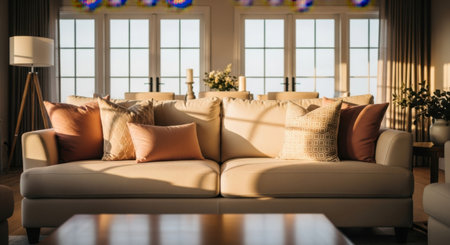 A warm, inviting living space featuring a comfortable sofa bathed in natural light.