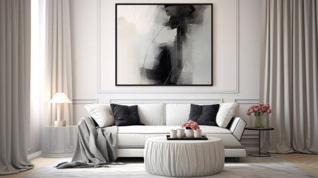 a modern living room featuring a grey black sofa and a captivating black abstract art piece. the artwork showcases elements of trace monotone and classical academic painting, with soft tonal transitions and expressive abstracts. the piece is rendered in a tondo format, using oil on canvas to create soft and captivating textures. ai generated