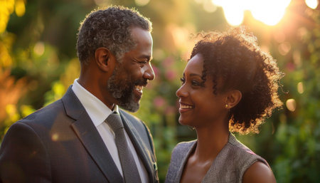 A man and a woman in formal wear are smiling at each other in a grassy field. The man has a beard and a tie, and they both seem happy. Its a beautiful adaptation of people in nature
