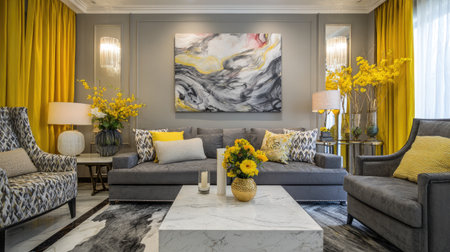 A modern living room showcases a gray sofa, patterned armchairs, and yellow accents in curtains and decor. An abstract painting hangs above the sofa, complemented by lamps and flower arrangements. The composition suggests a well-lit space, suitable for interior design, lifestyle, or home decor projects.