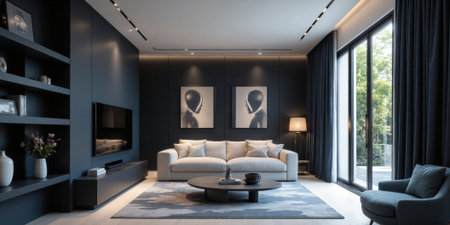 Smart living room in midnight navy, with AI-powered entertainment systems that adapt to the users preferences and mood. The room