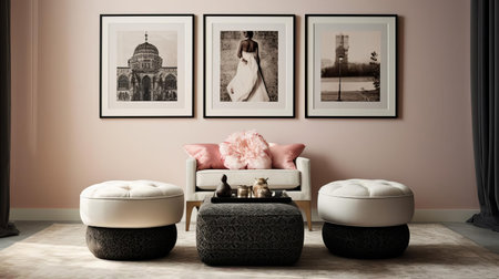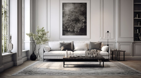 Elegant house interior design featuring a contemporary neutral sofa faux poster farmes dried flowers in a vase coffee tables decorative accessories and elegant personal accents. Template