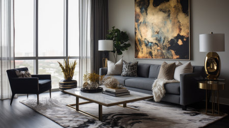 This elegant living room features a blend of modern design elements with luxury furniture and decor. Bright urban apartment setting with neutral colors.