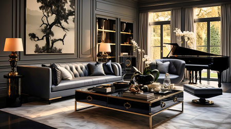 Luxury living room interior design with black leather sofa, coffee table, books and vase of flowers