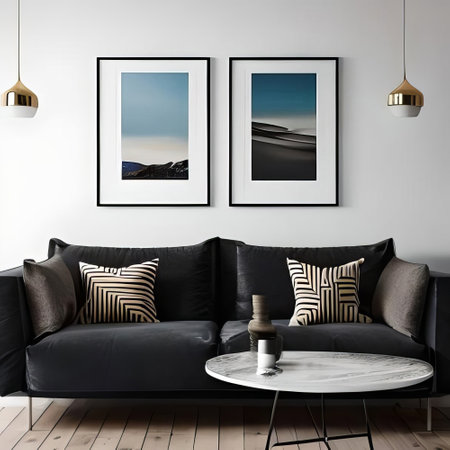 Living room interior with sofa, coffee table and picture frames on wall