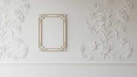An ornate white wall intricate floral bas-relief plaster molding and a decorative gold-trimmed frame, showcasing...