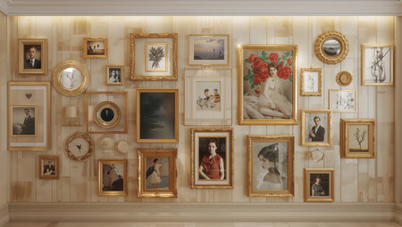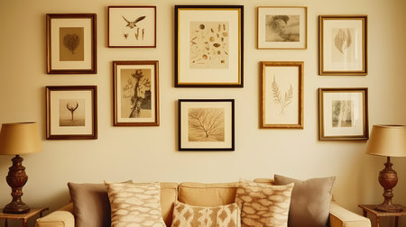 a gallery wall with a mix of framed photos and art pieces, created with generative ai