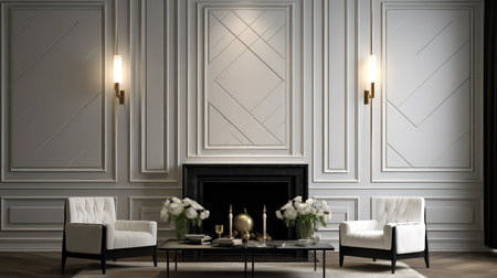 Detail of the interior of a room with a wall decorated with moldings