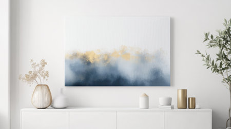 Concept illustration of a modern living room with a picture frame on the wall. Generative AI