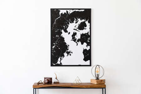 Design scandinavian interior of living room with wooden console, white wall, retro camera, lamp and elegant personal accessories. Stylish mock up poster map. Modern home decor. Template.
