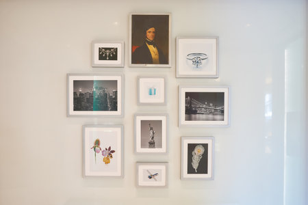 abstract blurred photo frame hanging on white wall, decoration interior in restaurant