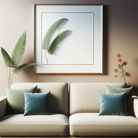 Interior of the living room with a beige sofa and a picture frame. 3d render