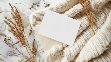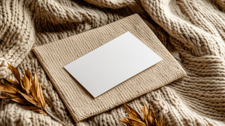 A minimalistic blank card resting on a cozy knitted sweater, ideal for creating elegant mockups and inviting designs with a warm, inviting texture.