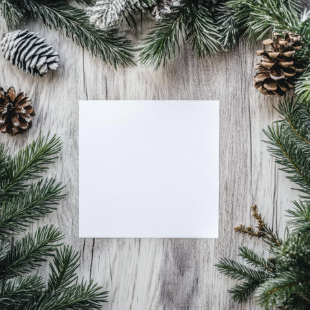 A square blank paper sits among green pine branches and winter cones, perfect for writing heartfelt holiday messages or invitations.
