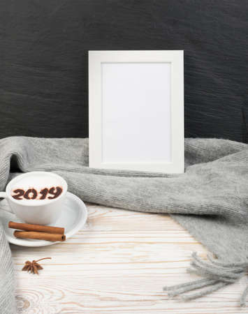 2019 Macchiato or Latte Cappuccino on Rustic Wooden Background with Grey Plaid. Hot Coffee Cup with Cream Milk Foam on Wood Table