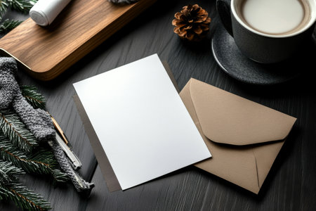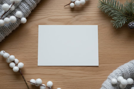A warm and inviting Christmas setup showcasing a centered blank card surrounded by festive organic d