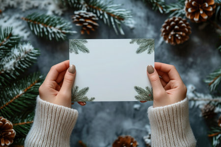 Female hands holding blank greeting card on christmas tree background. Top view, flat lay.