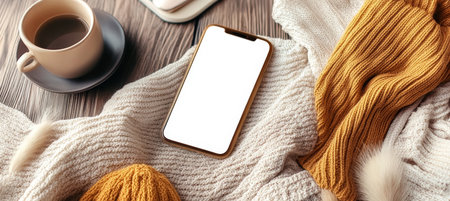 Smartphone with blank white screen on a warm knitted sweater, autumn flat lay, cozy home concept