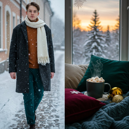 Collage of a young man in winter clothes with a cup of hot chocolate on the windowsill.