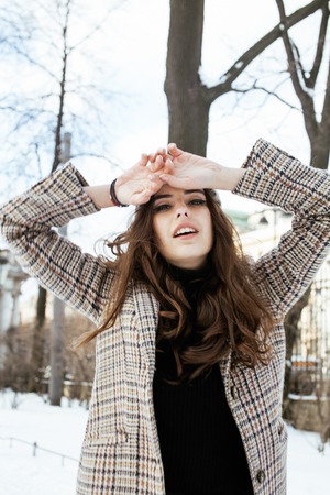Beautiful young brunette woman in winter clothes posing outdoors. Beauty, fashion.