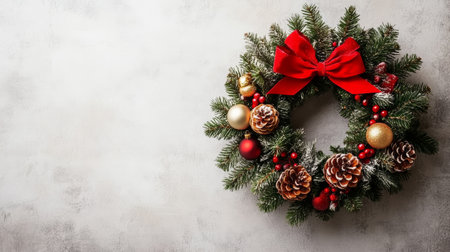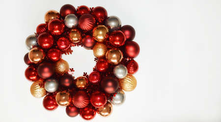 Christmas wreath with red and gold ornaments and bow on a white textured background. Ideal decoration for Merry Christmas and Happy New Year events.