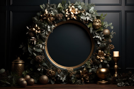 A minimalist black room with a focus on a stunning gold Christmas wreath hanging on the wall, adding a touch of festive elegance to the space. Generative Ai