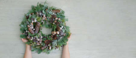 Christmas banner with natural wreath with fir cones, nuts and acorns. Woman holds Christmas wreath on a light wooden background.
