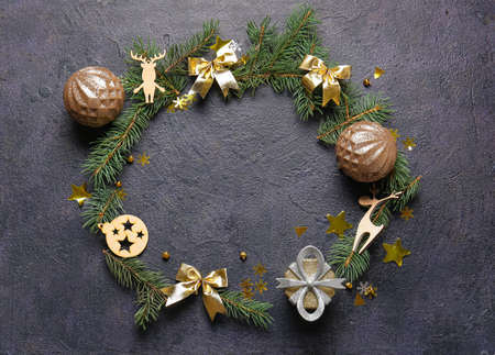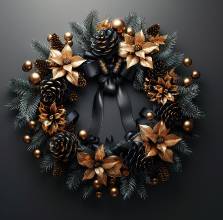 Christmas decorated wreath on a black and gold background, seasonal winter holiday