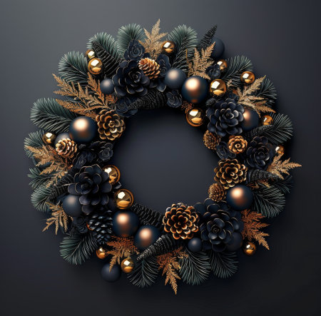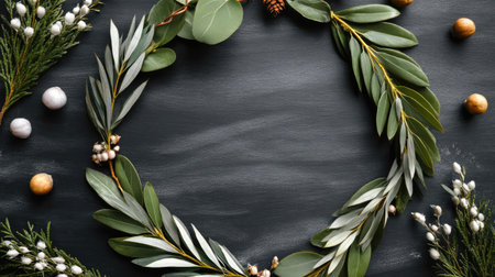 This elegant greenery wreath features leaves, pinecones, and natural elements set against a dark background, perfect for winter decoration or botanical themes.