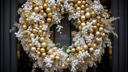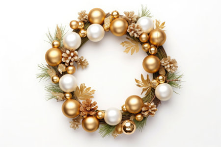 A stunning Christmas wreath featuring metallic ornaments and golden leaves. Perfect for holiday-themed projects, this design captures winter's elegance and warmth.