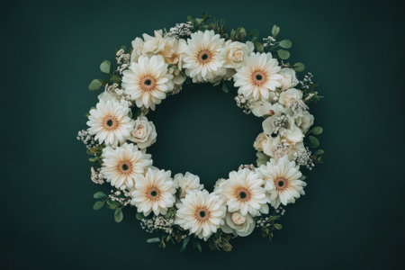 A large wreath of white and beige flowers on a dark green background, top view, photography backdrop, studio lighting. --ar 3:2 --v 6.1 Job ID: 87f8dd52-ebdb-4b58-874e-6d1588db6e1f