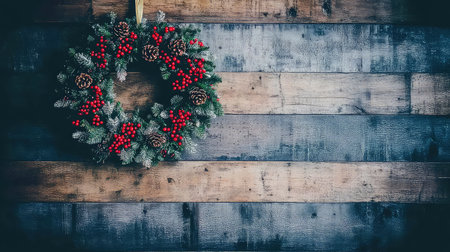 This stunning Christmas wreath features pine cones and bright red berries, perfectly set against a rustic wooden background, evoking holiday cheer and warmth.