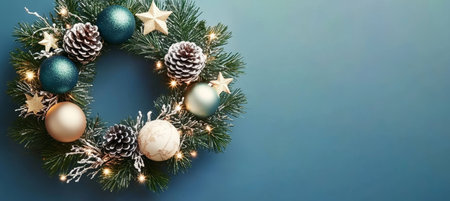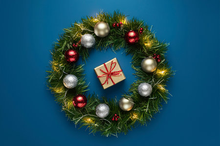 Holidays new year concept. Advent christmas door wreath with festive decoration on a cozy background. Copy space flat lay top view